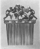 Room 16 introduces us to the famous fourth century Scythian burial-mounds of Solokha and Chertomlyk, situated at the place where, according to the ancient Greek historian Herodotus, who left behind a description of Scythia, the “royal Scythians” lived, having brought into subjection tribes of nomad and ploughmen Scythians. Herodotus informs us that the royal Scythians buried their “kings”, i.e. chiefs, in the lands of the Gerrhi which cover approximately the territory of the present-day province of Zaporozhye. The Solokha mound, on the left bank of the Dnieper, not far from the town of Nikopol, was excavated from 1912 to 1913. An embankment eighteen metres high (58.5 ft.), concealed two vaults; one of them, in which was found a woman of high birth, proved to have been plundered – all that remained were two horses in rich attire, gold dress ornaments, a gold needle and two vessels, one silver, the other bronze. The second vault, remarkable for its extraordinary riches, contained the body of a chief, his weapon-bearer, a servant, five horses and a stableman. The head of the dead chief was covered with a heavy bronze helmet; gold rings and bracelets adorned his arms, and around his neck was a gold, crescent-shaped ornament (grlvna). The splendour of the attire, embroidered with gold plaques, was further heightened by an iron sword in a gold sheath and a delicately wrought gold phial – a symbol of power. Hundreds of bronze arrow-heads, seven silver vessels, a ladle and sieve for wine, three enormous pots with remnants of food – this is far from being the complete list of objects found in the grave. Beside the head, of the chief lay a comb, the only relic of antique jewellery of its kind. The gold comb from the Solokha mound -12.3 cm. high (4.7 in.) and weighing 294.1 grams (10 ounces) – has nineteen tetrahedral teeth, above which runs a frieze formed by the figures of reclining lions. The frieze is surmounted by a sculptural group: a horseman, accompanied by a lightly armed foot-soldier, is repelling the attacks of his enemy who has dismounted as a result of an accident – his wounded horse is fighting in its death throes and blood is pouring from a deep neck wound. The outward appearance of the Scythian warriors, their clothes and their weapons are reproduced with a doc-umental-like accuracy. The comb, like the majority of the items from the Scythian burial-mounds, is of Greek origin, evidence of the close trade connections between the Scythians and the Greeks.