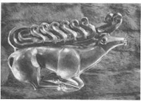 The Hermitage possesses excellent examples of Neolithic art, among them drawings on stone representing hunting scenes. Discovered on the cliffs of the north (Devil’s Nose Cape on the eastern coast of Lake Onega, and the lower reaches of the river Vyg which flows into the White Sea), the drawings came into the museum in 1935. Amongst these impressive designs, drawn on the surface of granite by means of stone tools in the second millennium B.C. (the tribes of the north were not familiar with metal at that time), we can recognize, in spite of the schematized outlines, boats with oarsmen and the figures of animals (elks and deer) and birds (swans and ducks). One genuine masterpiece of Neolithic sculpture is the head of she-elk, made of horn, found in the province of Sverdlovsk during work in a peat-bog. There are also some stone carvings of fish, from the area of Lake Baikal, used as fishing bait (cases 8 and 27)