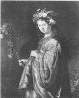In Flora Rembrandt portrayed his wife Saskia as the goddess of spring and flowers. She is dressed in a heavy satin garment, and the head of the young woman is crowned with a spray of flowers. The beautiful gold and olive-green colours are characteristic of Rembrandt’s work of the 1630s. The main theme in his art is the world of human feelings, and this is seen in canvases painted during different periods and on various subjects. Almost at the same time as Danae Rembrandt painted the Descent from the Cross (1634). The limpid darkness makes it possible to descern in the distance the vague outlines of the town. The light of the torches and the lamps flickering in the breeze bring individual figures sharply from out of the darkness, and it is this contrast of light and shade which expresses to the utmost the tragedy of the scene. The personages of the painting are simple Dutch folk; the Virgin, an elderly, haggard peasant woman, is falling into the arms of her friends who have hastened to her assistance.